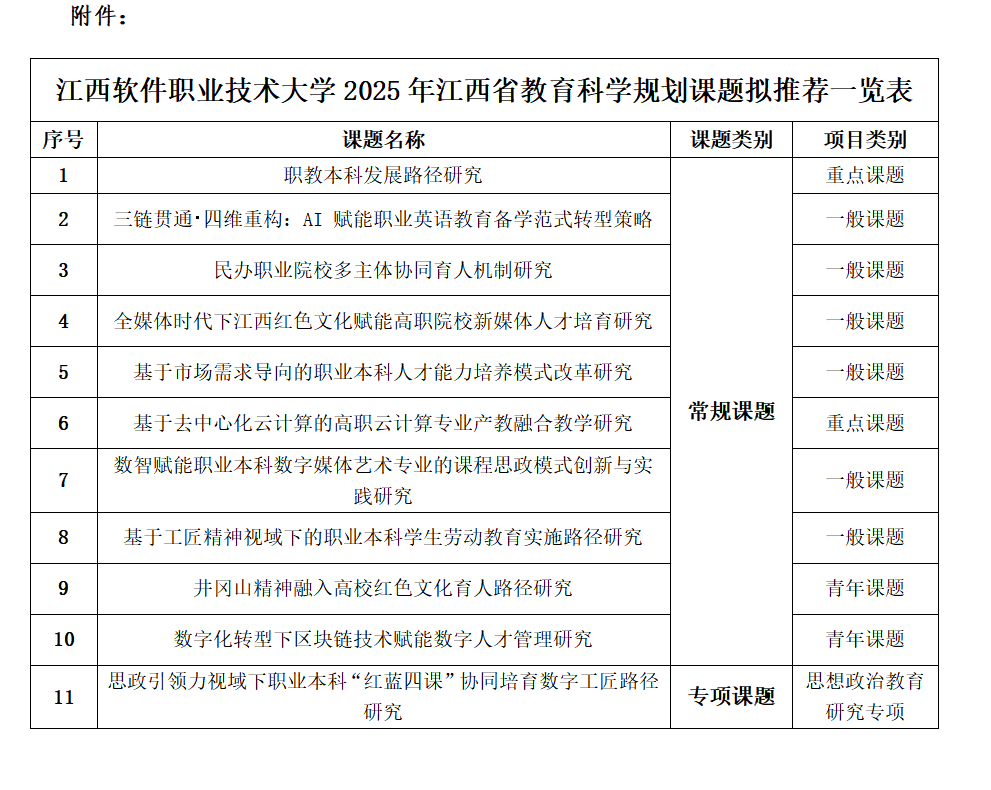 根據《關(guān)于開(kāi)展 2025 年江西省教育科學(xué)規劃******學(xué)校按照公開(kāi)、公平、公正的原則,組織校內外專(zhuān)家認真、嚴格評審,擬推薦以下共計11項課題(常規課題10項、思想政治教育研究專(zhuān)項課題1項),現將名單(見(jiàn)附件)予以公******學(xué)??萍继帟?shū)面反映。