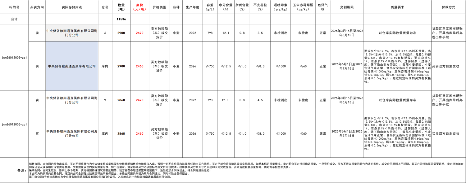 本次交易采用購銷雙向競價(以采競銷)模式,即委托方與競價方通過一次交易同步實現(xiàn)同等數(shù)量糧油的采購和銷售。以采競銷模式下,競價參與方只對銷售標的底價進行競價,一旦銷售標的物應價成交,則相應采購標的物以交易清單中公布的價格成交,銷售價格以競價交易結(jié)果為準。通過一次交易實現(xiàn)購銷雙向交易合同。競價參與方須仔細閱讀本交易公告、清單及其他相關文件,謹慎評估自身風險承擔能力和市場、政策風險,衡量決定是否參與交易,一旦參與,須承擔相應的風險和責任,自覺履行相關義務。中標方須保證輪出小麥流向符合國家有關規(guī)定,并不得用作中央和各級地方儲備小麥的輪入,否則一切法律和政策責任全部由中標方自行承擔。